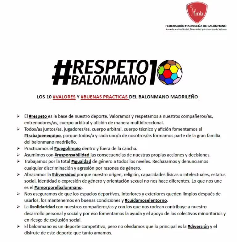 Os comunicamos que nuestro club se ha adherido a la Campaña de la FMB firmando el Compromiso #Respeto10Balonmano. Así, hacemos nuestros los 10 valores y buenas prácticas del Balonmano Madrileño: